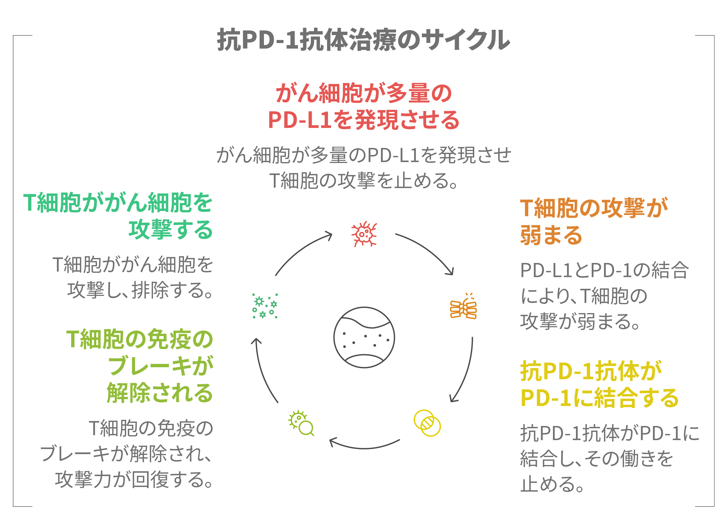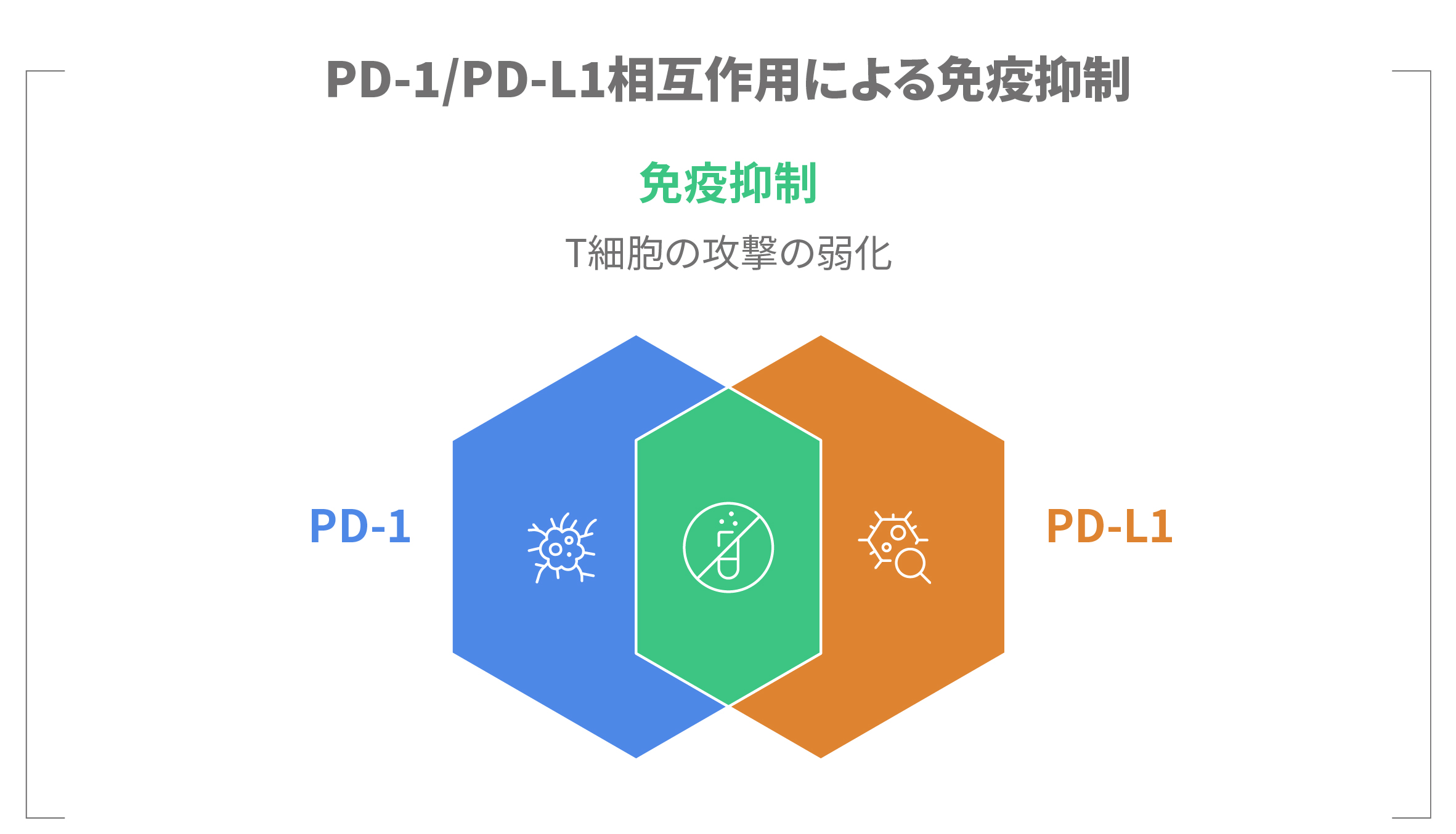 PD-1は主にT細胞側にある受信装置で、PD-L1はがん細胞を含むさまざまな細胞側にある信号分子です。